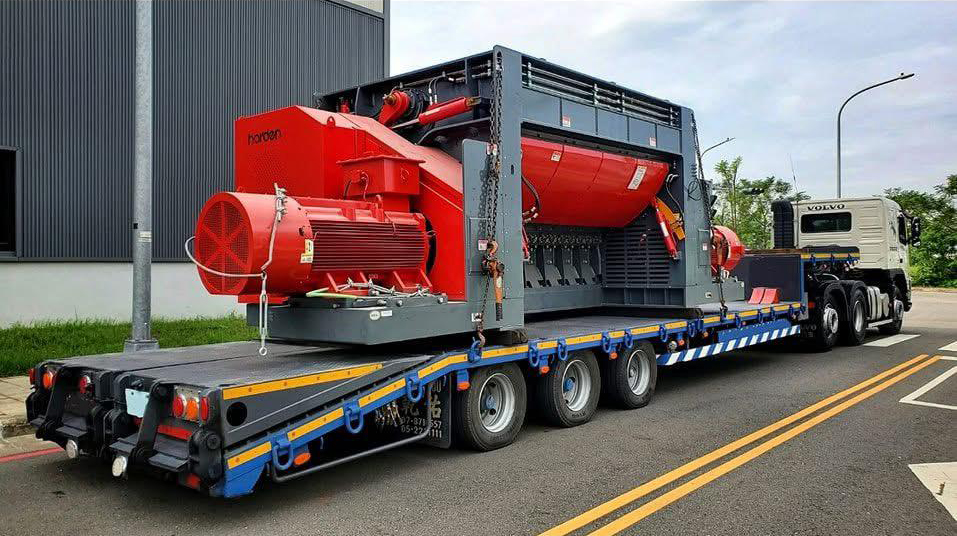 The trailer is a low-bed type, designed to carry oversized or heavy equipment that cannot be transported on standard-height trailers. It has multiple axles to distribute the weight of the heavy load and ensure stability on the road. Chains or straps are visible, indicating that the machinery is properly secured for transport.